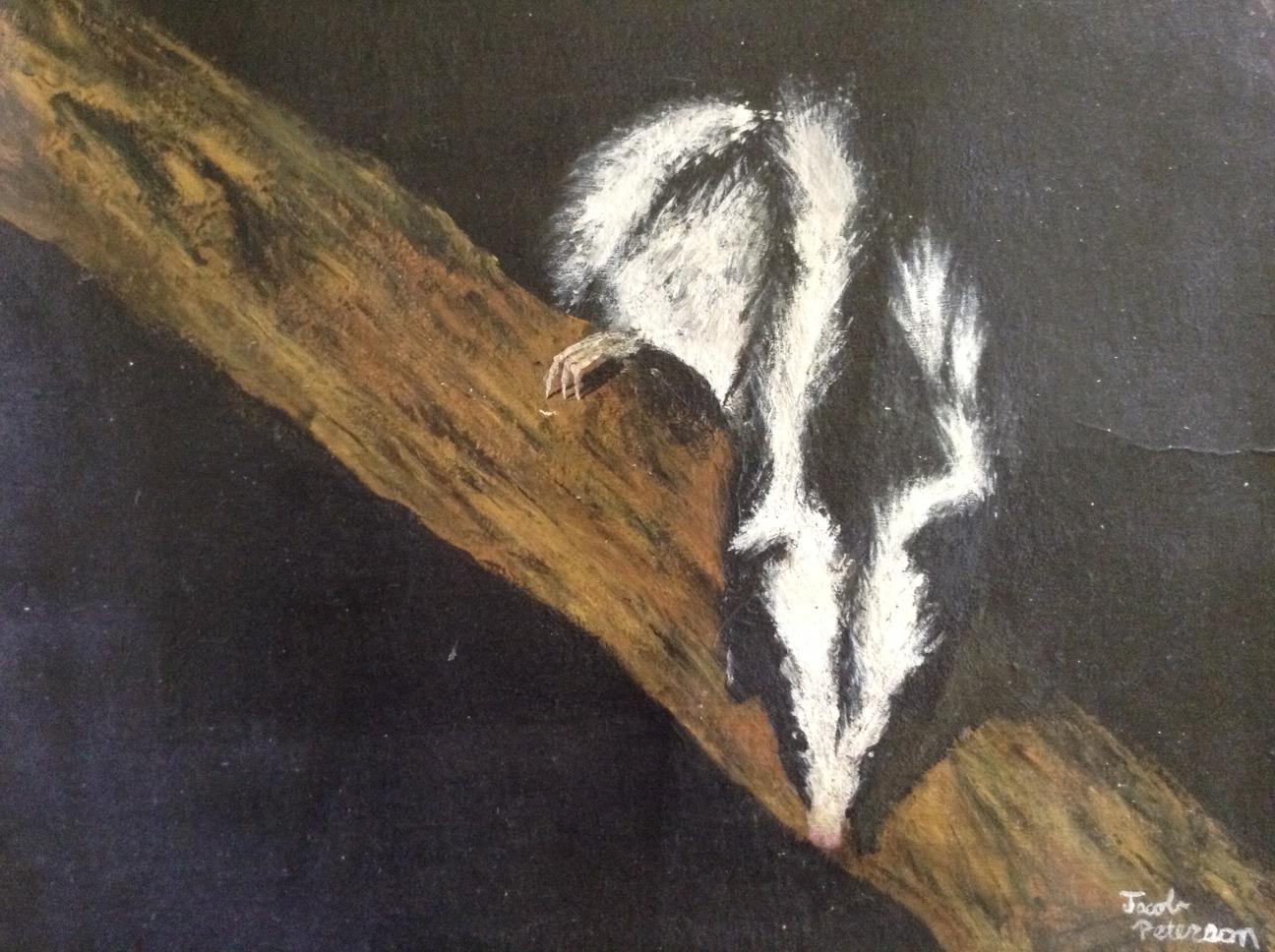 Jake does not consider himself to be an artist, per SE. These two paintings are from his high school years. However, I think they are both worthy of note, from the adorable realistic skunk, right down to his perfectly crafted skunk toe nails, this is a nice work of art.